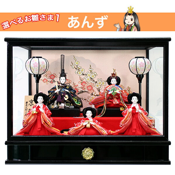 おめでたい紅白梅が華やかにお雛様を引き立たせます!!縁起の良い物を沢山取り入れた【あんず】はぱっと目をひく華やかさ満点の豪華なケース飾りです。
